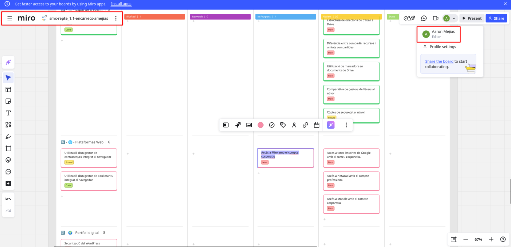 Accés a Miro amb el compte corporatiu: Per accedir a la plataforma Miro, s’ha emprat el compte corporatiu proporcionat pel centre. Això permet col·laborar en espais de treball compartits, participar en activitats interactives i organitzar idees de manera visual i en temps real.