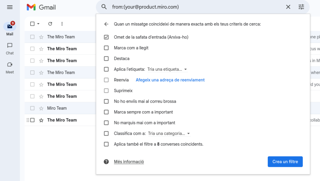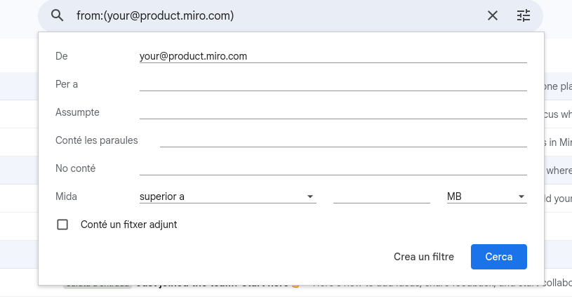 2- Un cop estem creant el filtre, haurem d’omplir els paràmetres amb les dades que volem, en el meu cas aplicaré un filtre per no tenir la safata d’entrada completa dels correus d’spam de Miro, per això hauré d’omplir el paràmetre “De” i omplir-lo amb el mail que volem filtrar < “Crea un filtre”: