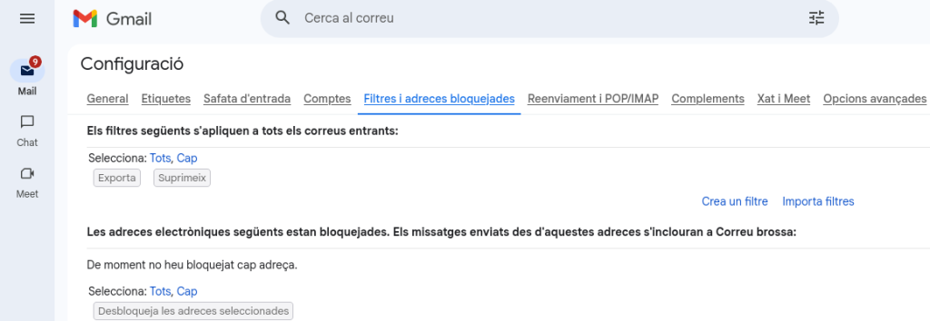 1- Per començar hauràs d’anar al teu servei de correu electrònic, en el meu cas, ho faré amb Gmail. Cercarem la configuració General a “⚙️”< “Filtres i adreces bloquejades” < “Crea un filtre”: