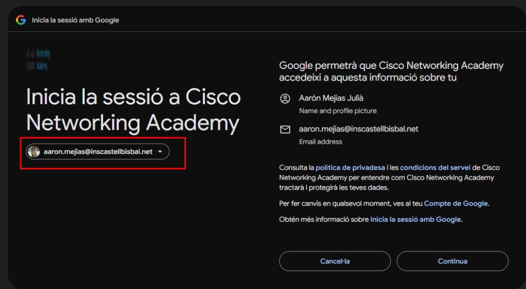 1- Per començar explorarem a la pàgina oficial de descarrega de Cisco Packet Tracer (netacad.com/portal/resources/packet-tracer) i iniciarem sessió amb el nostre compte corporatiu a l’apartat “Iniciar sessió”: