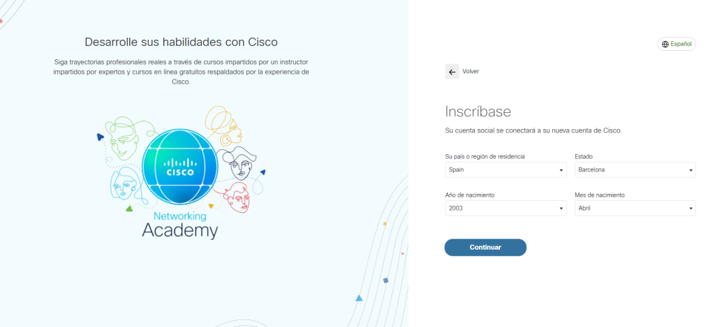 2- Seguidament d’inicar la sessió amb el nostre compte corporatiu, Cisco ens demanarà Inscriure’ns a la pàgina omplint amb les teves dades personals: