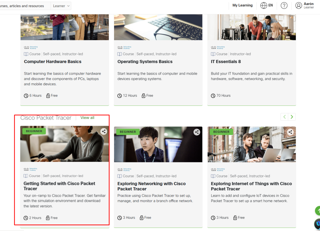 3- Iniciada la sessío a la web, navagarem en ella fins cercar un curs anomenat “Getting Started with Cisco Packet Tracer”: