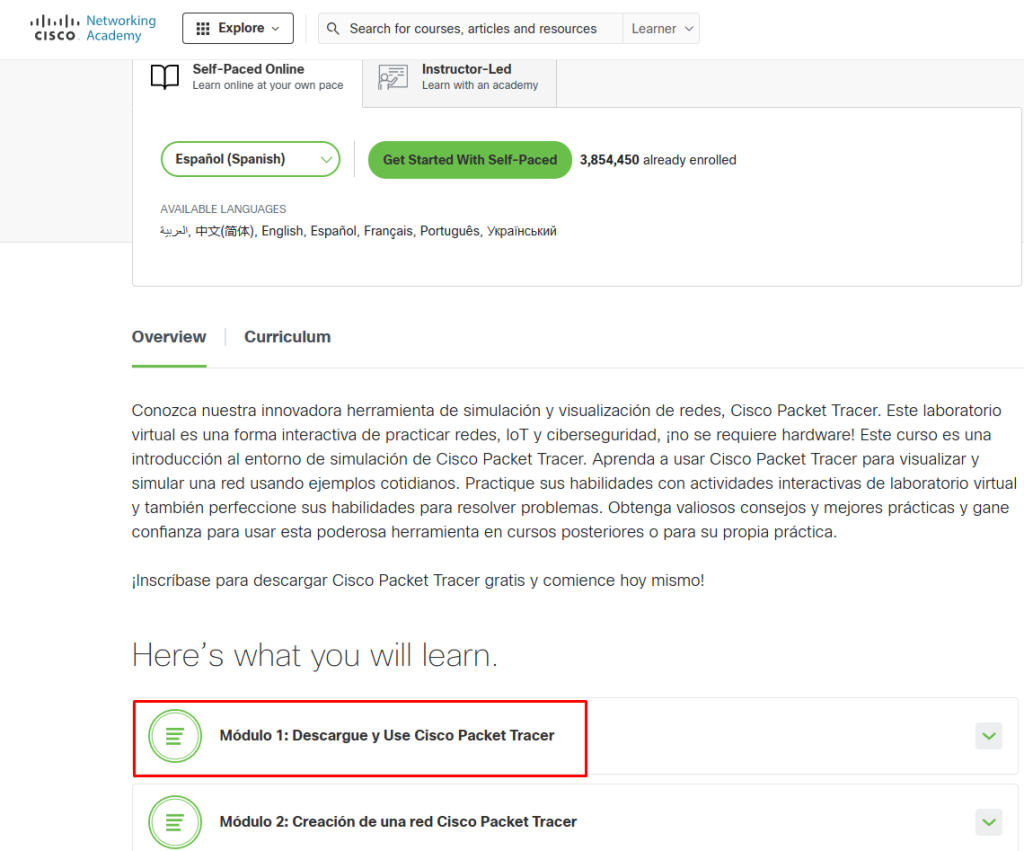 4- L’informació d’aquest curs ens pauta el seu contingut en un índex al qual podem veure que un dels mòduls és la descarrega de Cisco Packet Tracer, li clickarem al botó verd “Get Started With Self-Paced” per començar la lliçó: