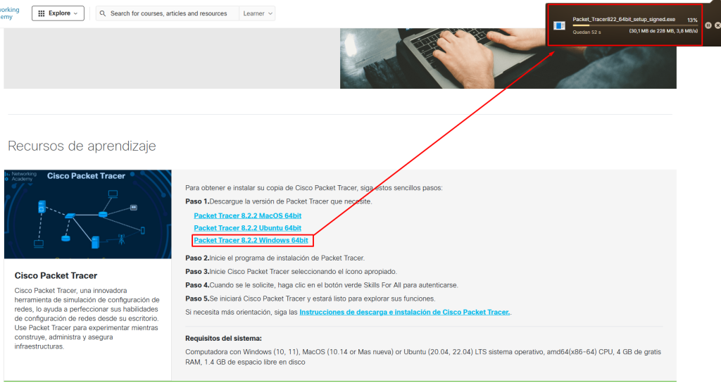 6- Un cop aquí, ja podrem descarregar l’executable (.exe) del nostre Packet Tracer per poder fer les nostres xarxes, només haurem d’escollir la versió del nostre SO: