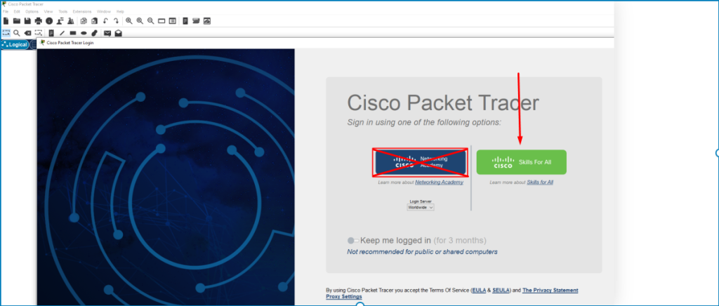 8- Amb l’executable finalitzat, obrim Packet Tracer i ens demanarà tornar a iniciar sessió, li donarem al botó verd “Skills For All”: