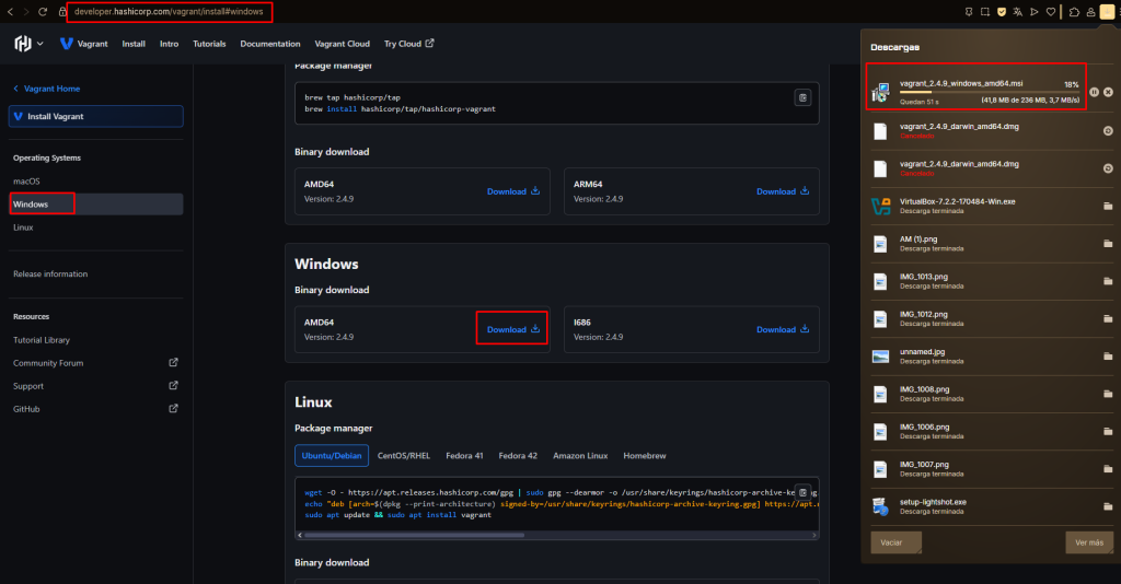 1- Primer de tot navegarem a la pàgina oficial de descarrega de Vagrant (https://www.vagrantup.com/downloads) i al menú de la part esquerra de la pàgina seleccionarem la versió del nostre SO per descarregar el paquet (.msi) de Vagrant: