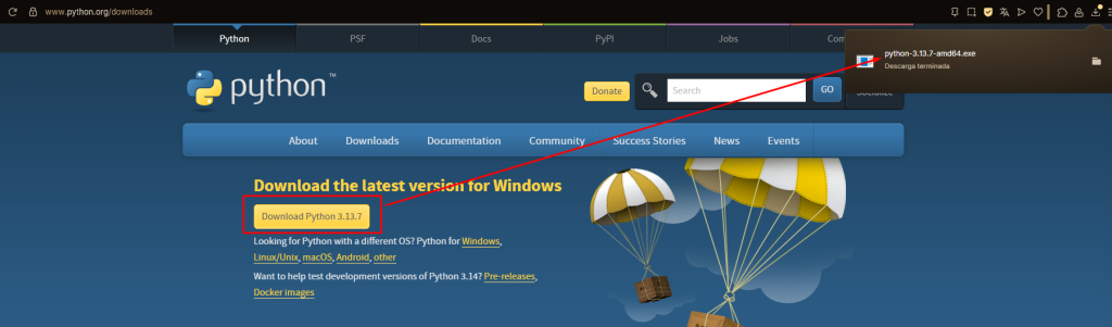1- Per l’instal·lació de Python anirem a la pàgina oficial de descarrega (https://www.python.org/downloads/) i el mateix lloc web detectarà el teu SO, clicka al botó groc “Download Python X.XX.X” i es descarregarà l’executable (.exe) de Python: