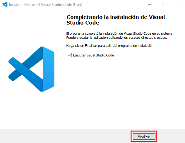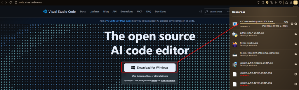 1- Per començar anirem a la pàgina oficial de descarrega de Visual Studio Code (https://code.visualstudio.com) i clickarem al botó gran al mig de la pantalla “Download for SO”, això començarà la descarga del seu executable (.exe):