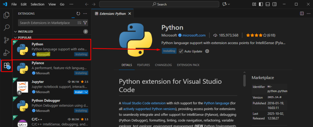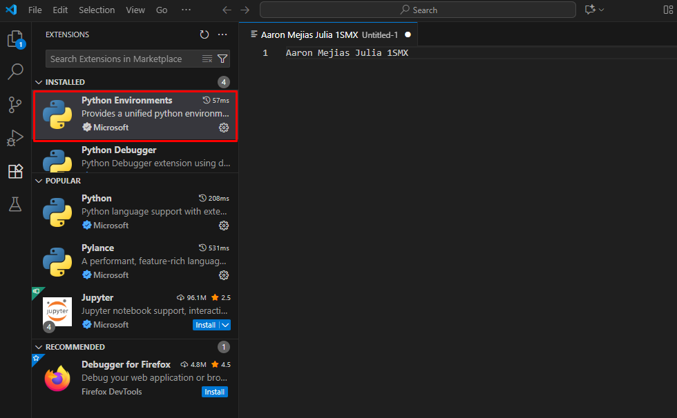 3- Tenint tant Python com Visual Studio code ja instal·lats ja es pot configurar per utilitzar-los, dins de Visual Studio Code en el menú de l’esquerra anirem a l’icona d’extensions, cercarem la versió oficial de Microsoft de Python i l’instal·larem