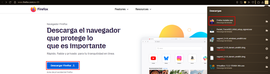 1- Per començar, haurem d’escollir un navegador, això pot variar molt personalment depenent del cas de cadascú, amb el meu cas, al ser Mozilla Firefox el navegador utilitzat a la meva corporació acadèmica, aquest serà el seleccionat, per tant, navegarem fins a la pàgina oficial de Firefox (https://www.mozilla.org/firefox/) i cercarem el botó blau “Descargar Firefox” per descarregar l’executable (.exe) del nou navegador i un cop finalitzi l’obrirem: